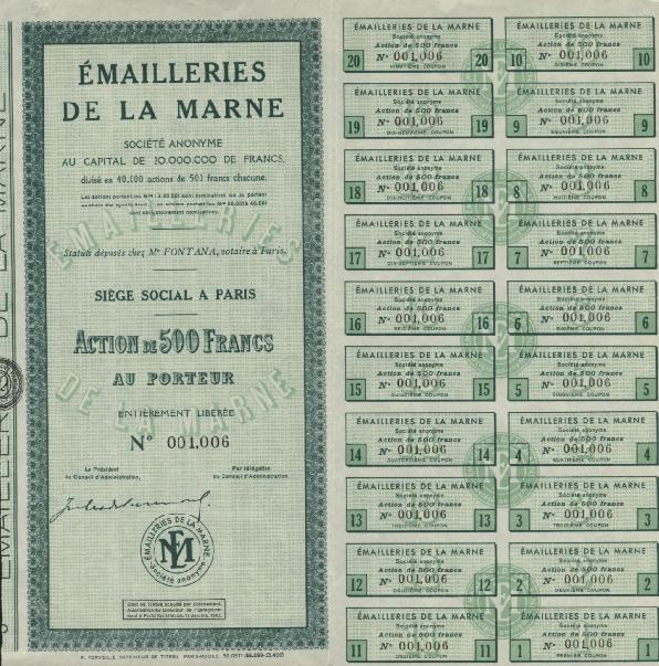 Bearer stock for 500 francs issued by the Emailleries de La Marne.