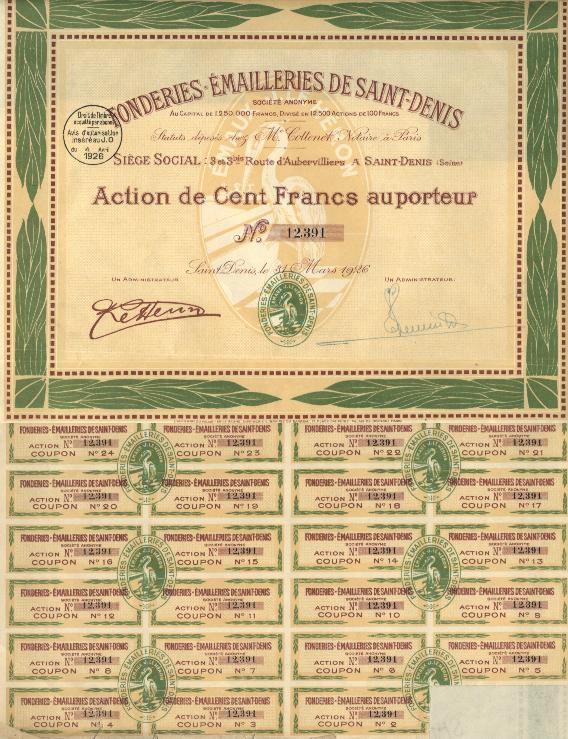 Bearer stock for 100 francs issued by the Foundries & Emailleries od Saint-Denis.