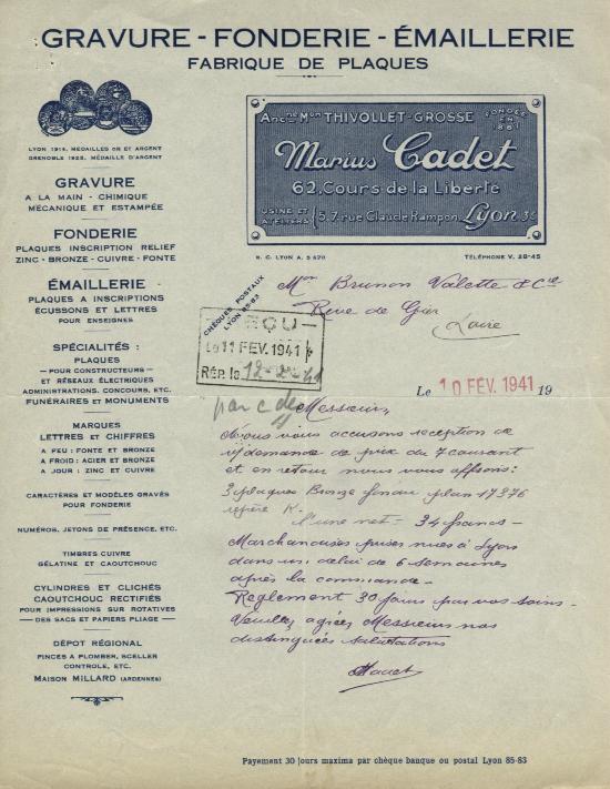 Letter from Establishments Cadet dated 10th February 1941 to Brunon Valette & Co.