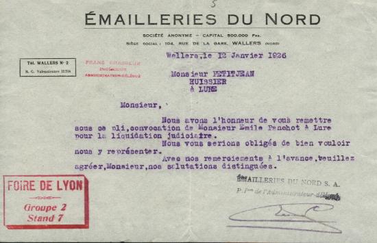 Notice from 'Emailleries du Nord' to their process server dated 12th January 1926.