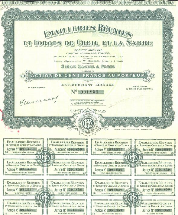 Bearer stock for 100 francs issued by the Emailleries Reunies.