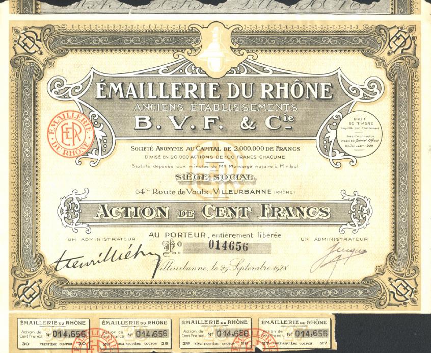 Bearer stock for 100 francs issued by the Emaillerie du Rhone.