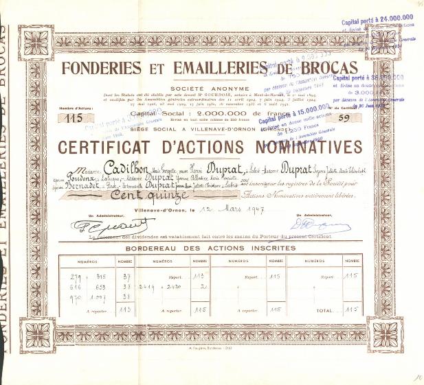 Stock certificate from the 'Fonderies et Emailleries de Brocas'.