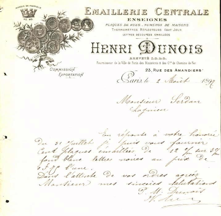 Letter from the Emaillerie DUNOIS from August 02 1897.