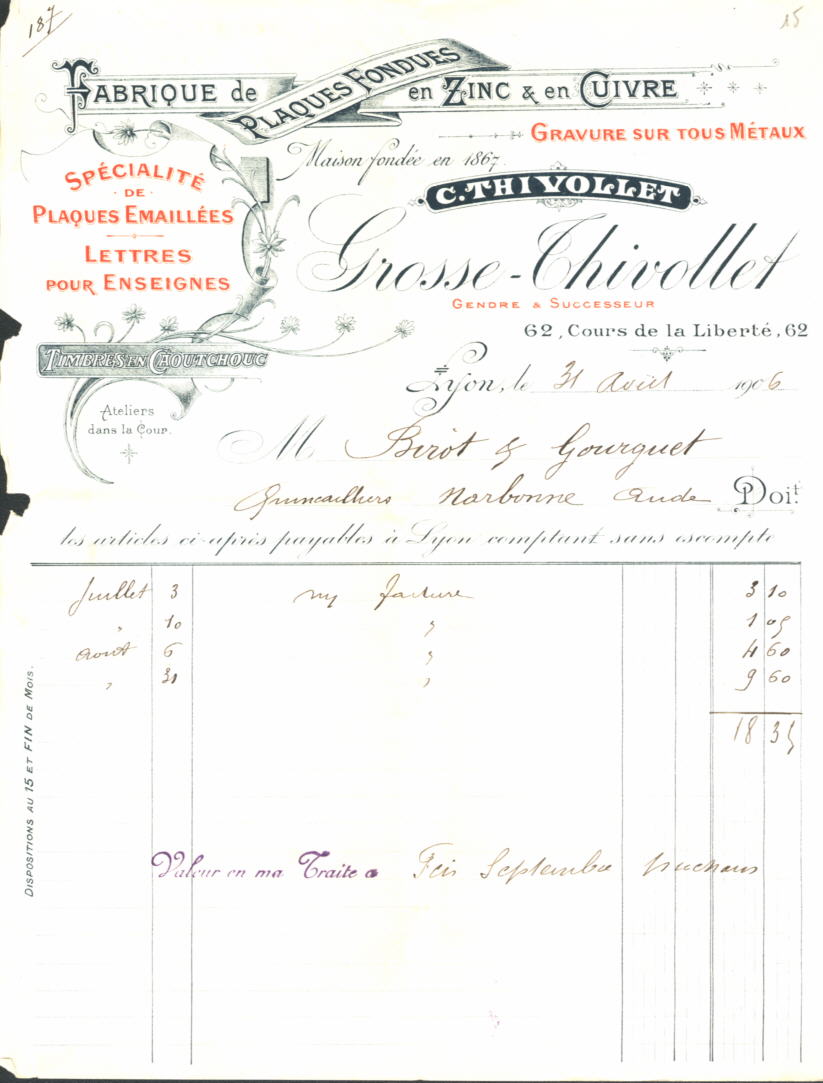 Invoice from the 'Grosse-Thivollet' to Mr Berot & Gourguet.